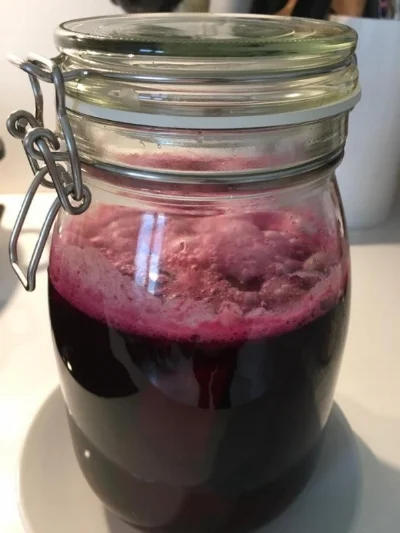 Rødbetkvass med skummende kahmgjær. Det er de små kullsyreboblene fra fermenteringen som gjør at det begynner å skumme.