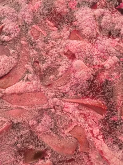 Her har kullsyrebobler i rødbetkvassen laget skum og formasjoner som ser lite innbydende ut.