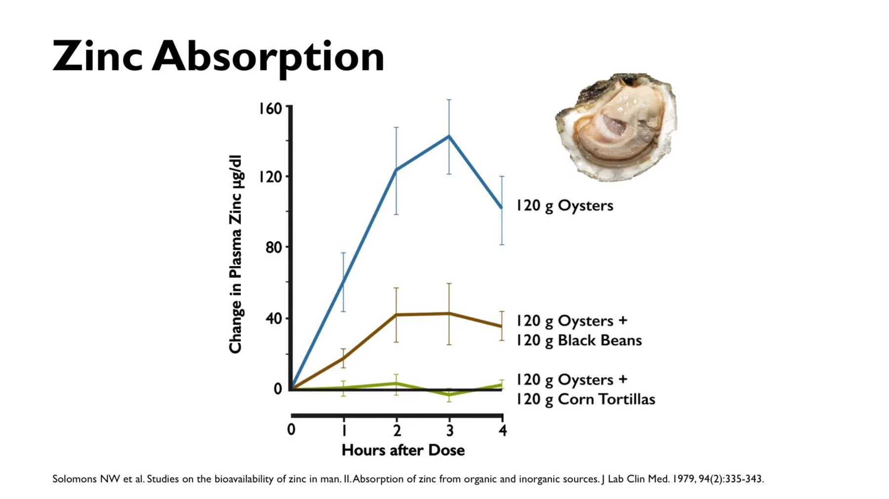 Bildet (hentet fra https://www.doctorkiltz.com/plant-toxins/) viser en graf etter undersøkelse av opptak av sink i kroppen. Østers inneholder mye sink. I kombinasjon med bønner ble opptaket av sink sterkt redusert. I kombinasjon med mais-tortillas ble opptaket så og si null: