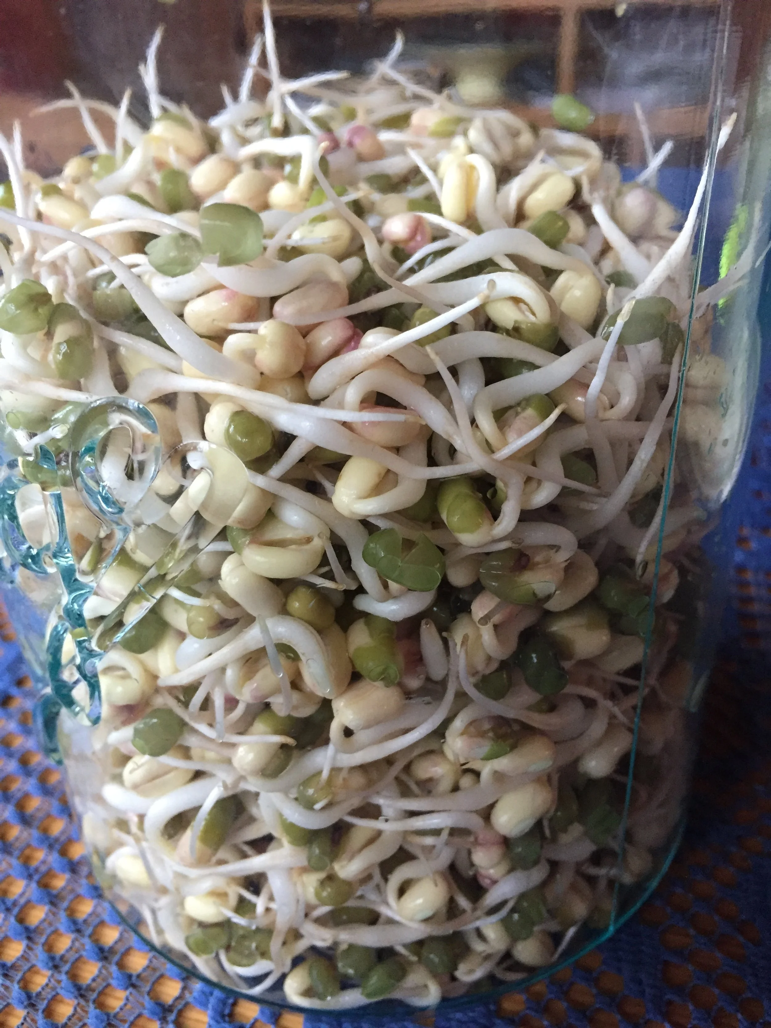 Her har jeg spiret mungbønner. Spirene skal deretter fermenteres i saltlake.