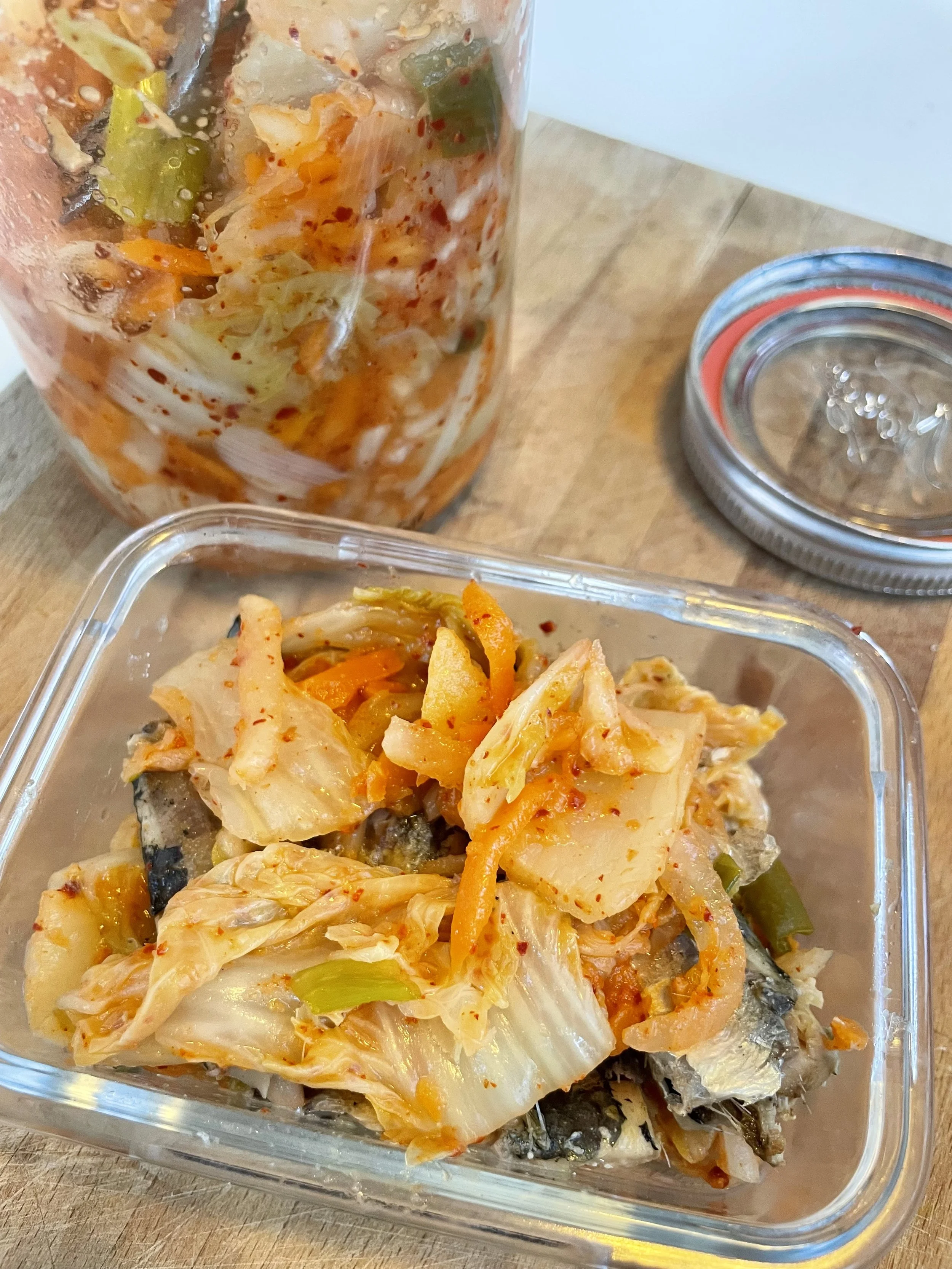 Andelår sto på menyen her hjemme for et par dager siden. Det nye var at jeg marinerte dem i kimchi, en kimchi som jeg satt til fermentering for et par uker siden. Resultatet var beste smaken på andelår man kan tenke seg. Begeistret over nyoppdagelsen, fikk kyllingklubber ligge noen timer i kimchimarinade i går. Deretter sardiner. Kort og godt vellykket! Dette må du prøve! Lenger ned finner du link til min steg-for-steg kimchioppskrift.