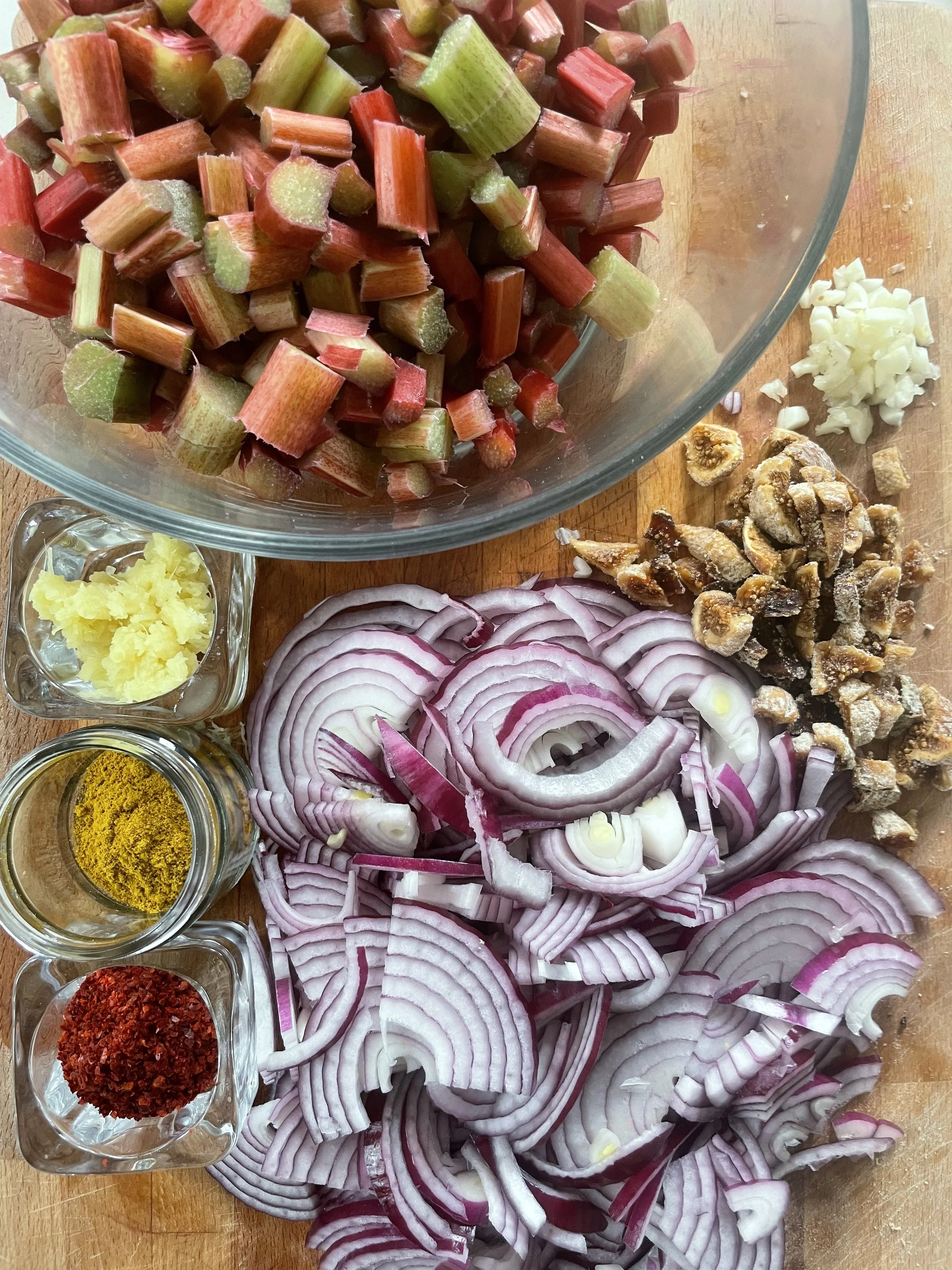 Bruk gjerne røde rabarbrastilker, de gir en fin farge på den ferdige chutnyen. Behold skallet. Skyll og kutt opp i biter.